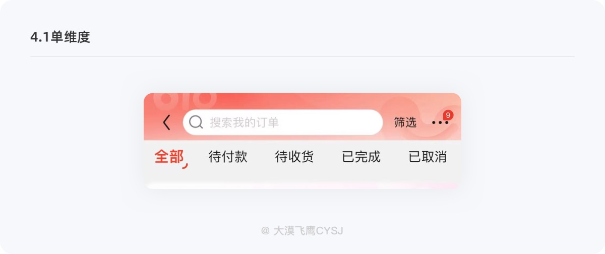 大方向快速切換,如:訂單(待支付 / 待發貨)、優惠券(未使用 / 已過期)。