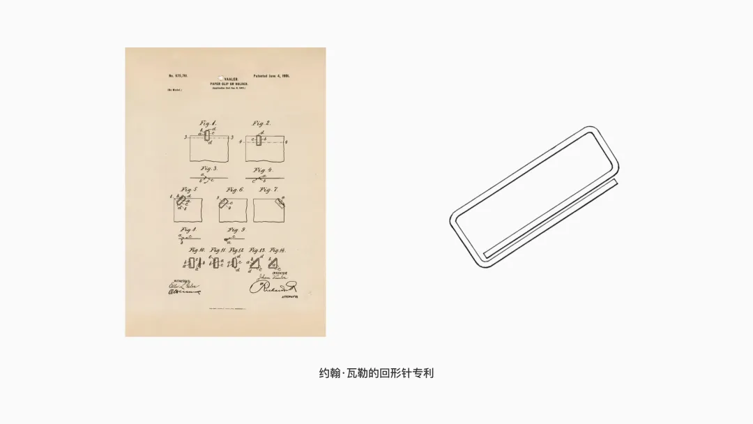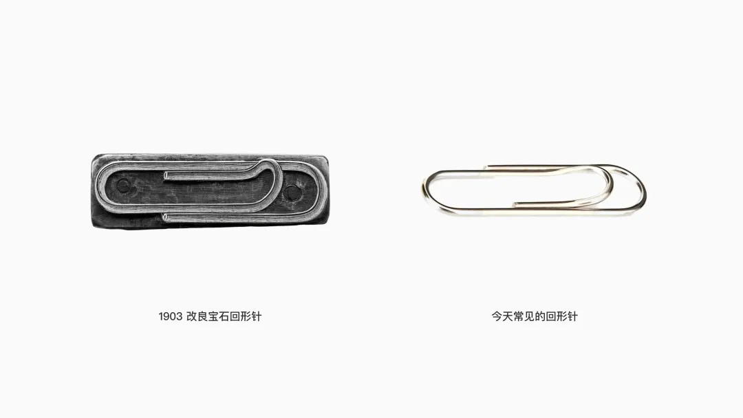 幾年后,喬治·W·麥吉爾(George W McGill)對寶石回形針做出了改良,進一步增大了內環的弧度,使其更明顯地上翹。相比初代寶石回形針平緩的環圈末端,這種上揚的開口形成了更清晰的“示能”——直觀地提示用戶“此處可拉開并插入紙張”。在結構上,它也實現了更省力的開合體驗。正是這一改良版本,逐漸演變成了今天最常見、最廣泛使用的回形針。
