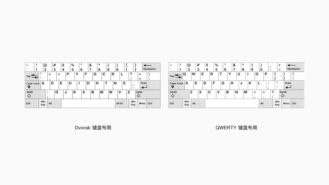 同樣的,歷史上也有其他證據表明 QWERTY 鍵盤并非最佳的鍵盤布局,比如美國心理學家發明的德沃拉克鍵盤布局(Dvorak keyboard layout):這一布局基于字母使用頻率和手的生理結構設計,擁有打字更快、更易學習和降低疲勞的特點。二戰時一項研究表明,德沃拉克布局的打字員速度要比 QWERTY 布局打字員快 74%。即使是 QWERTY 鍵盤的發明人——肖爾斯本人也沒那么篤定:盡管他很早就將設計賣給了雷明頓公司,但他終其一生都在不斷改進布局,并創造出各種替代方案,在他去世的前一年,他還為自己的 XPMCH 鍵盤申請了專利。