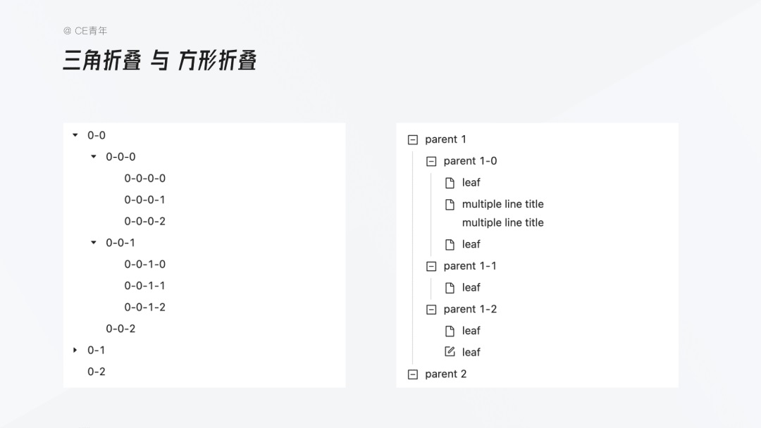 - 多選:必顯復選框,置于折疊圖標左側,預留后續功能拓展空間(新增、刪除、拖拽等),同時降低前端開發成本、減少 BUG。
