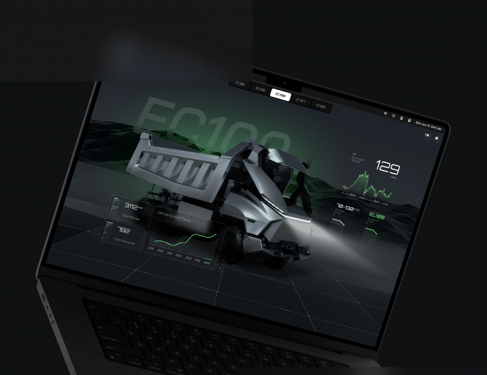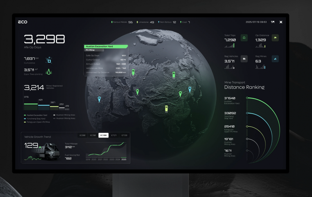 ECO 系統(tǒng)的視覺體系完全貼合礦山工業(yè)場(chǎng)景,以深邃的暗黑為基底,搭配高辨識(shí)度的科技綠作為主色調(diào),既凸顯了工業(yè)系統(tǒng)的嚴(yán)謹(jǐn)性,又通過高對(duì)比度讓核心數(shù)據(jù)、車輛狀態(tài)、區(qū)域標(biāo)識(shí)一目了然,完美適配礦山復(fù)雜的監(jiān)控與操作需求。