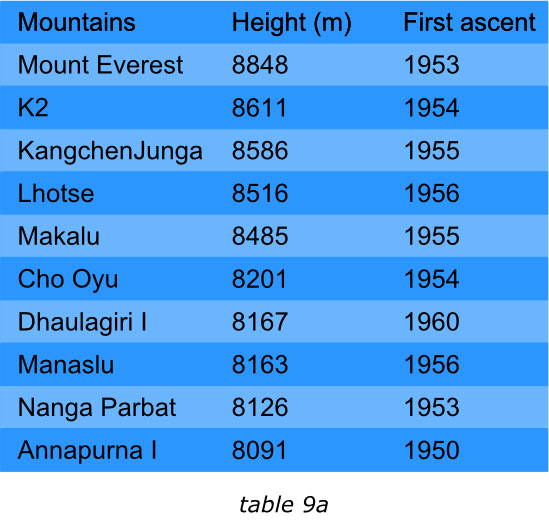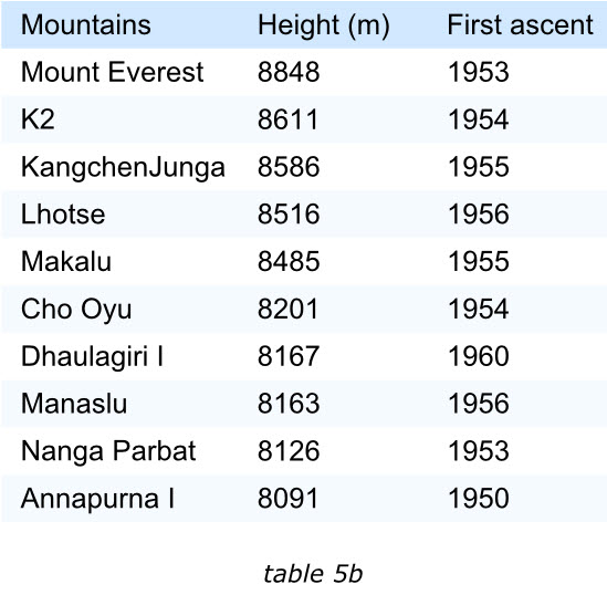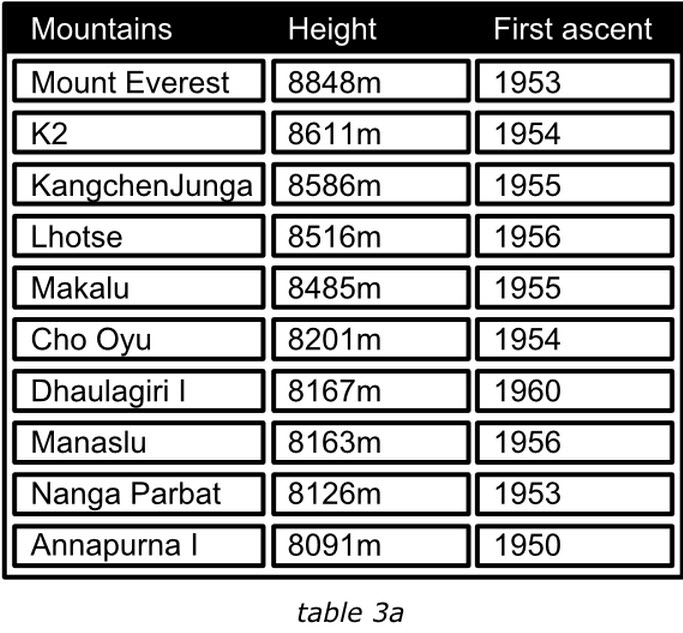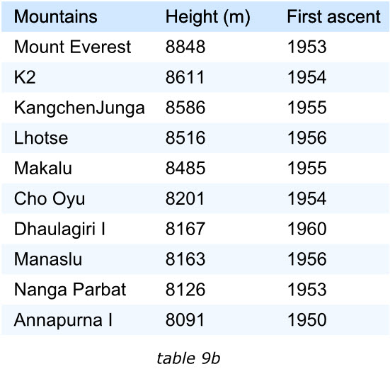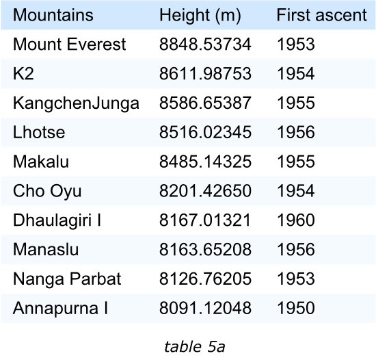 表格中的項(xiàng)目應(yīng)該通過某種排序的手段來滿足閱讀者的興趣。我們來看下面的兩個(gè)表格,左面的展示了世界上最高的十座山峰,鑒于“高度”最受關(guān)注,那么表格的項(xiàng)目就是按照這個(gè)字段降序排列的。這樣最受關(guān)注的信息能夠排在表格的最前面。