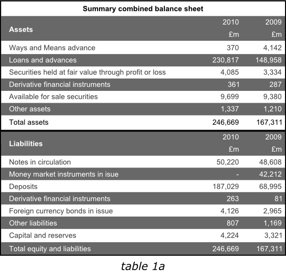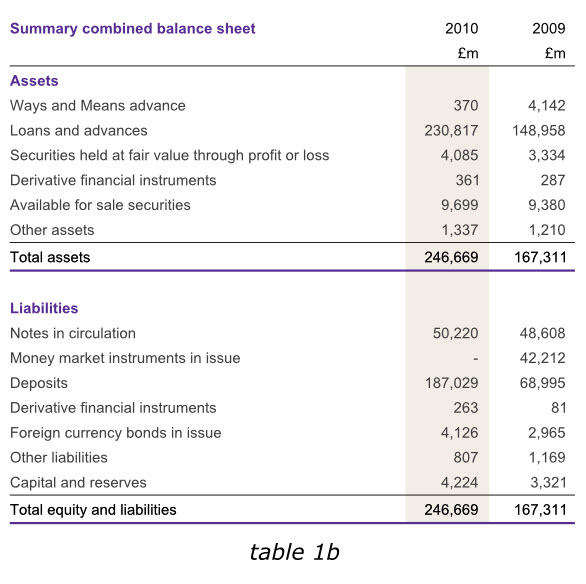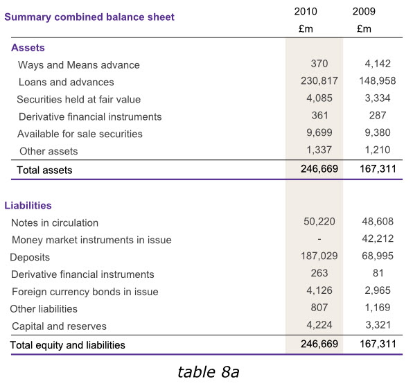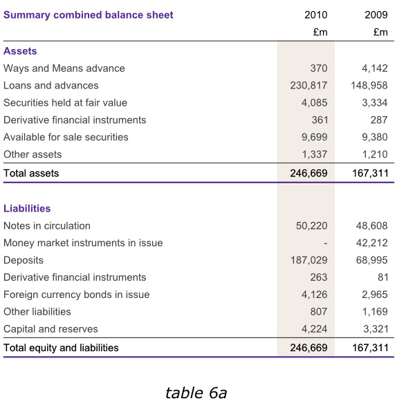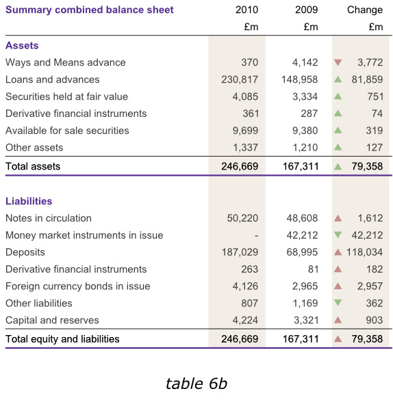 在英格蘭銀行2010年度報(bào)告中,盡管我們不能通過改變數(shù)據(jù)來達(dá)到讀者的期望,但是在其他同樣的報(bào)告中,我們?cè)谀┪苍黾右涣杏杏玫臄?shù)據(jù),以避免用戶在比較各年度數(shù)據(jù)的時(shí)候,還需要自行計(jì)算增長(zhǎng)或減少的幅度。下面第一個(gè)表格6a已經(jīng)增加了總資產(chǎn)和總負(fù)債數(shù)據(jù),而表格6b則在右側(cè)增加了新的一列,使我們更容易分析出哪些領(lǐng)域的經(jīng)營(yíng)成果發(fā)生了實(shí)質(zhì)性變動(dòng)。
