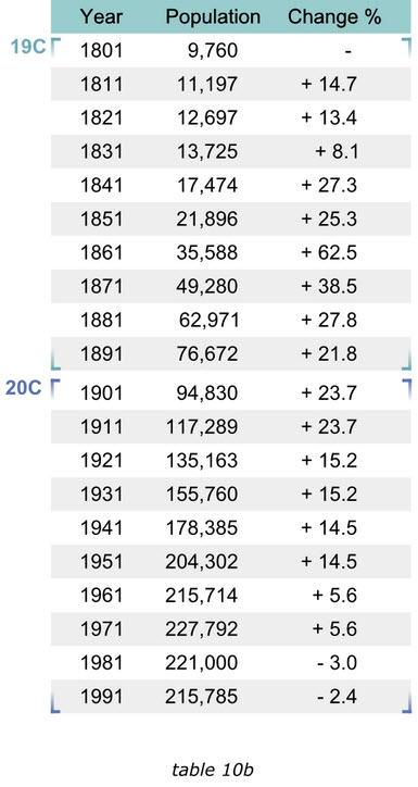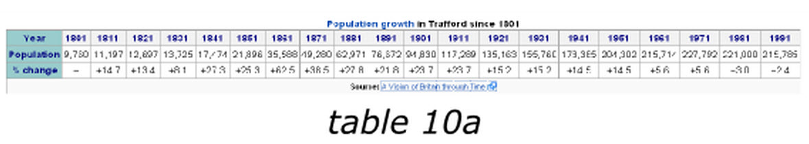 當(dāng)我們?cè)谧珜憌ikipedia上的Trafford條目時(shí),有一個(gè)1801至1991年的人口變化表格10a,他包含有2行20列,讀者必須記住有關(guān)信息,并且不停的對(duì)照表頭和數(shù)值來確認(rèn)他們的關(guān)系,否則他們就無法獲得趨勢(shì)信息。