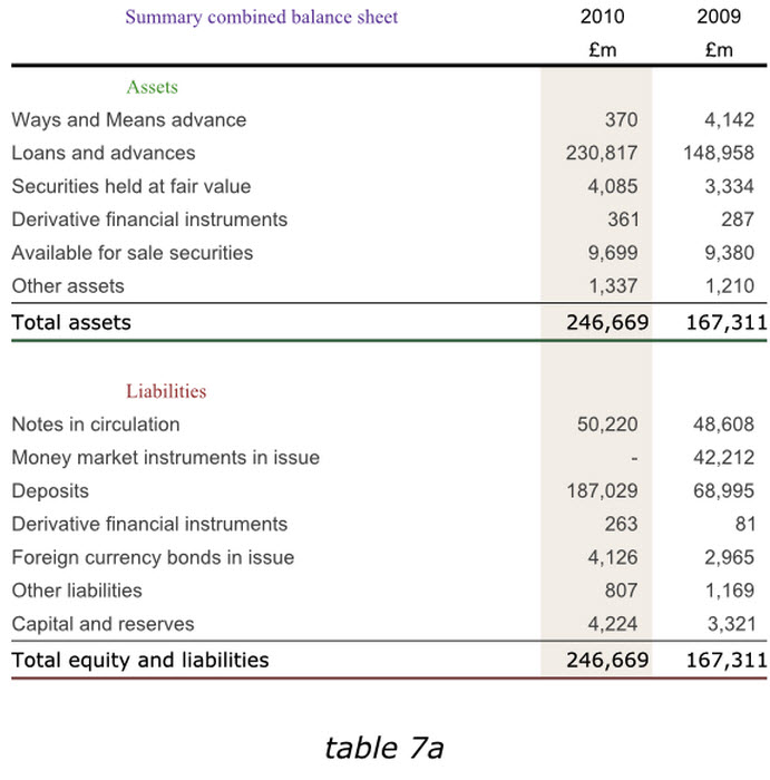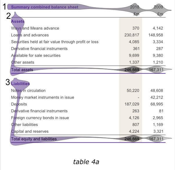 在表格中尋找信息時(shí),讀者希望前后采用同樣風(fēng)格,你應(yīng)該保證對(duì)同類元素使用同樣的字體,對(duì)同類數(shù)據(jù)使用同種對(duì)齊方式,還有諸如“列標(biāo)題”等各種突出顯示元素的一致性。看一下下面的表格7a,他展示了和前面表格1b同樣的英格蘭銀行2010年度數(shù)據(jù)信息。但是使用了有區(qū)分的表頭字體,標(biāo)簽以及加總格式,表頭采用了居中格式而不是和數(shù)據(jù)一樣右對(duì)齊,加總數(shù)據(jù)也沒有與數(shù)據(jù)嚴(yán)格對(duì)齊,同時(shí)為了區(qū)別資產(chǎn)和負(fù)債表格,他分別采用了不同顏色的字體,和表格中間粗細(xì)不同的線條。而所有這些實(shí)際上都讓我們產(chǎn)生一種不連貫的感覺,從而給瀏覽表格,把握重點(diǎn)帶來難度。