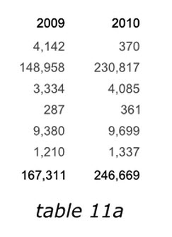在表格10a和10b中我們已經(jīng)了解到,當(dāng)數(shù)據(jù)處于一列的時(shí)候,人們很容的可以比較數(shù)據(jù)并發(fā)現(xiàn)趨勢(shì)。瀏覽者可以快速的從上之下掃描縱向數(shù)據(jù),而對(duì)于長(zhǎng)距離的橫向數(shù)據(jù),瀏覽就會(huì)遇到困難。然而我們?cè)賮砜匆幌卤砀?1a,去掉了所有的裝飾框,當(dāng)我們比較2009年和2010年數(shù)據(jù)的時(shí)候,數(shù)據(jù)橫向擺放要比11b中的上下擺放容易的多。