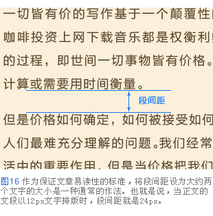 作為保證文章易讀性的標準,將段間距設(shè)為大約兩個文字的大小是一種通常的作法。也就是說,當正文的文段以12p文字排版時,段間距就是24px。當然,這個標準也并不是絕對的,有時候也可以通過刻意地設(shè)定狹窄的段間距,給讀者帶來內(nèi)容緊湊的印象。