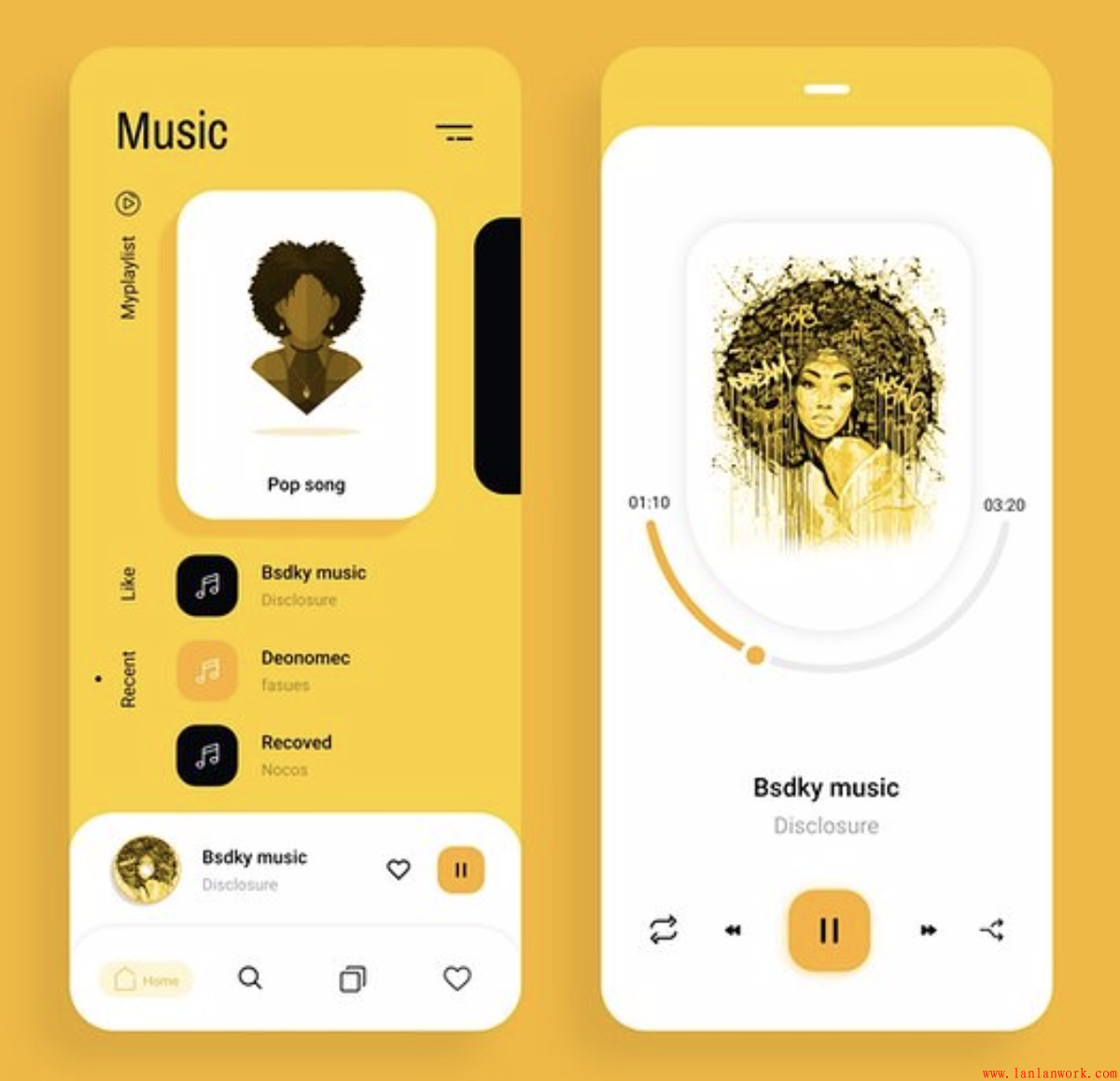 這是一個音樂APP,同前一個界面一樣,主頁的背景整屏是亮麗黃,卡片帶不同飽和度和明度的投影。按鈕和鼠標懸停狀態為黃色,有突出強調的作用。時間軸黃色和灰色相間。整體明朗的同時,增添柔和的色彩,讓人在這個音樂APP上流連忘返。