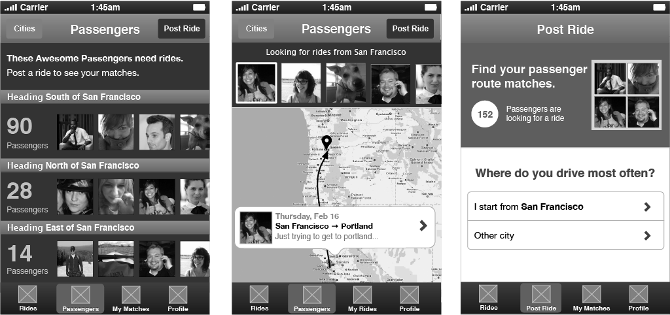 首先,我們分析了駕車者通常會出于怎樣的目的來發起拼車活動,并將這些原因列成一份清單。接下來,我(英文原文作者)對應著這份清單繪制了一些簡單的草圖,將有可能符合駕車者需求的功能和內容初步的勾勒出來。然后,大家對這些草圖進行討論評估,將其中我們認為最可行的5個概念進一步落實到線框原型當中,并向一些目標用戶(獨自駕車者)進行了展示,通過他們的反饋來驗證我們的假設。