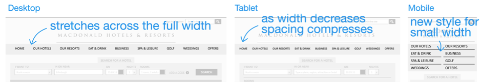 我們將使用一個真實的酒店網站 作為范例,來演示響應式Web設計的流程。這個網站是我們在九月份剛剛為Macdonald連鎖酒店創建的。在整個設計開發流程中,有幾個關鍵步驟,是我們接下來要逐一展開學習的: