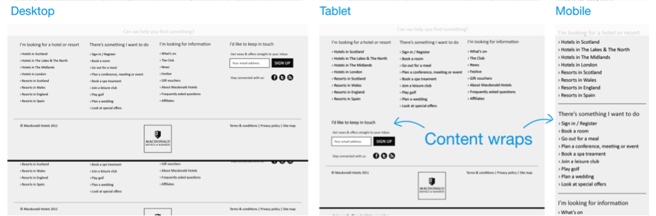 接下來我們需要考慮的是,每一列中的模塊組件應該以怎樣的方式隨著頁面的寬度縮放而響應式的適應和調整。在這個過程里,保持團隊成員之間的溝通是非常重要的,包括視覺設計師、前端開發人員等;使用初步的線框原型,與大家交流模塊組件在布局和樣式方面的調整計劃,盡量在初期就讓相關成員對整個規劃做到心中有數,并盡早發現前端實現等方面的潛在的問題。