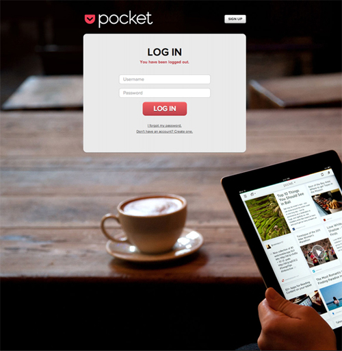 在很多時候你未必需要做的如此特別。以Pocket 為例,他們的登錄頁面具有很強的“歡迎”色彩,一幅巨大的背景圖片烘托出了該應用的使用場景,讓用戶覺得身臨其境,在情緒上產生共鳴。