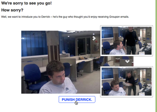 這方面最經典的案例莫過于Groupon的著名段子,"懲罰Derrick"。雖然這個過場發生在用戶確認退訂之后,但它通過真實的人物以及鋒利而又自嘲的幽默,切實拉近了用戶與網站之間的距離。在這個多多少少會使退訂用戶產生內疚的段子之后,Groupon還會再慫恿用戶重新進行訂閱。雖然你清楚的知道這是他們玩的小伎倆,但在如此具有代入感的段子面前,多數用戶會覺得非常有趣,正面情緒和狀態完全被調動起來。