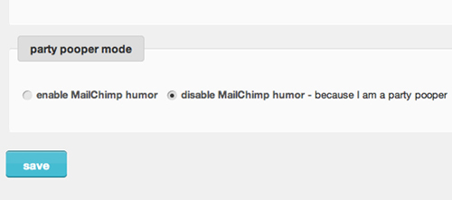 再次以MailChimp為例,他們提供了一種“party掃興模式”,那些對幽默風格不感冒的用戶可以在這里禁用那些有意思的設計元素。