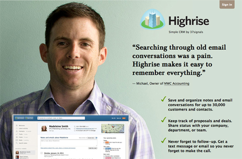 通過這張圖片,Highrise 向我們展示了一個快樂的人,還有他使用該公司產品的故事。來自實際客戶的微笑以及贊許之辭,這是非常正面的、非常容易促使潛在用戶認同并期望獲取其產品的宣傳形式。