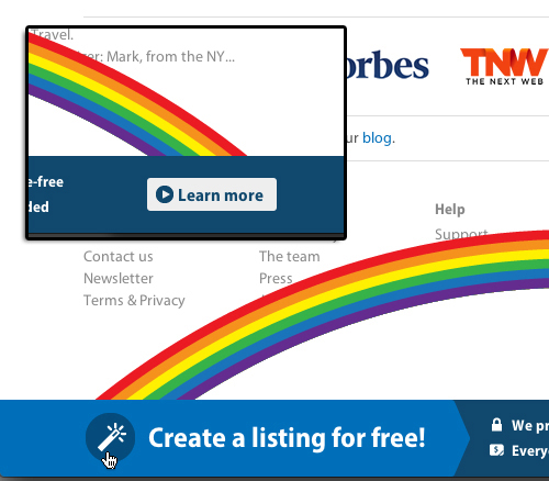 驚喜 :瀏覽到頁腳,你會發現鼓勵你免費創建活動的圖標與文案,當鼠標懸停在圖標上的時候,一道絢麗的彩虹會突然冒出來,它的動畫效果所指向的正是引導用戶這個操作的按鈕。