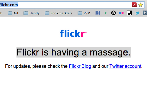 用戶在Flickr進行系統維護或升級期間會看到"Flickr正在做按摩"的提示,如果有興趣的話還可以到他們的官方博客或是微博當中查看當前的具體狀況。這樣的文案比起簡單粗暴的出錯提示來說更能讓用戶接受。