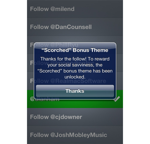 驚喜、專享 :在應用中打開主題設置界面后,安裝了Tweetbod的用戶會收到一條消息,恭喜他們獲得了專享的額外主題。這些用戶很可能因為受到了特殊照顧而感到開心,另外,這個群體在口碑傳播方面的作用是相當大的。