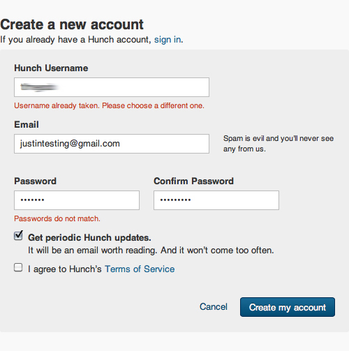 Hunch 注冊頁面當中的文案與我們通常能夠見到的那種有所不同,他們會在輸入郵件的文本框旁邊告訴你“垃圾郵件是魔鬼,我們可不干這事”,還會在選擇郵件訂閱的地方提示你“這會是值得一讀的郵件,而且來的不會太頻繁”。在這些很普通的地方稍稍花些心思,制造一些細微的差異化,這會增強產品的代入感,使用戶的注意力更集中,跟隨設計的指引完成操作目標。