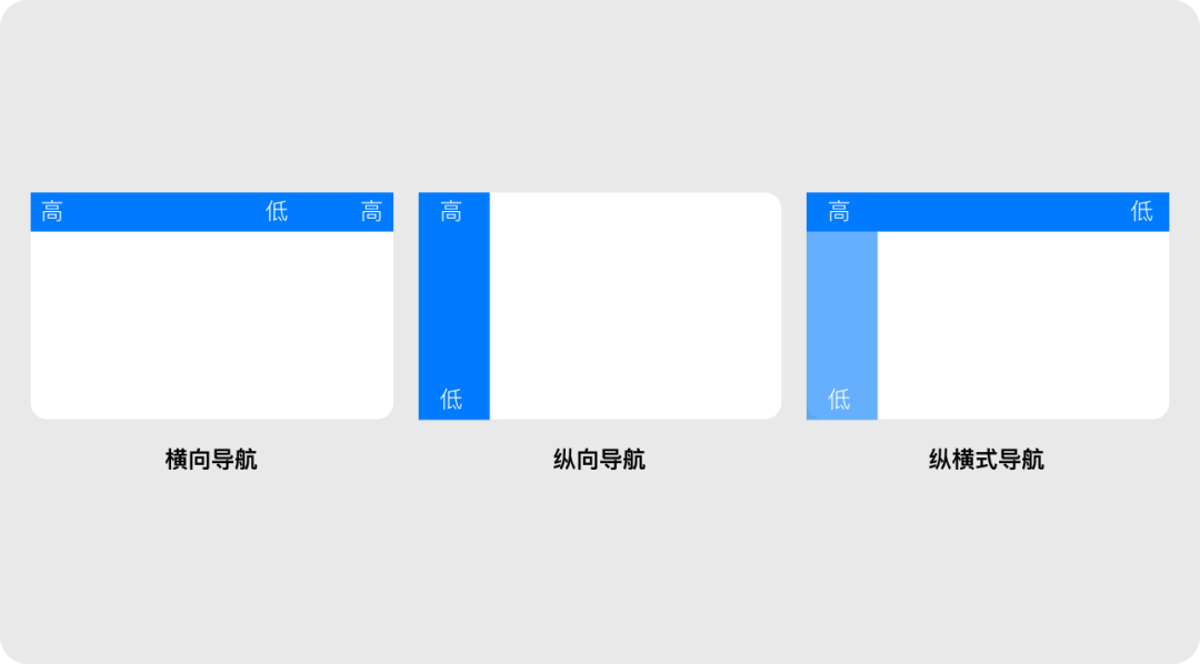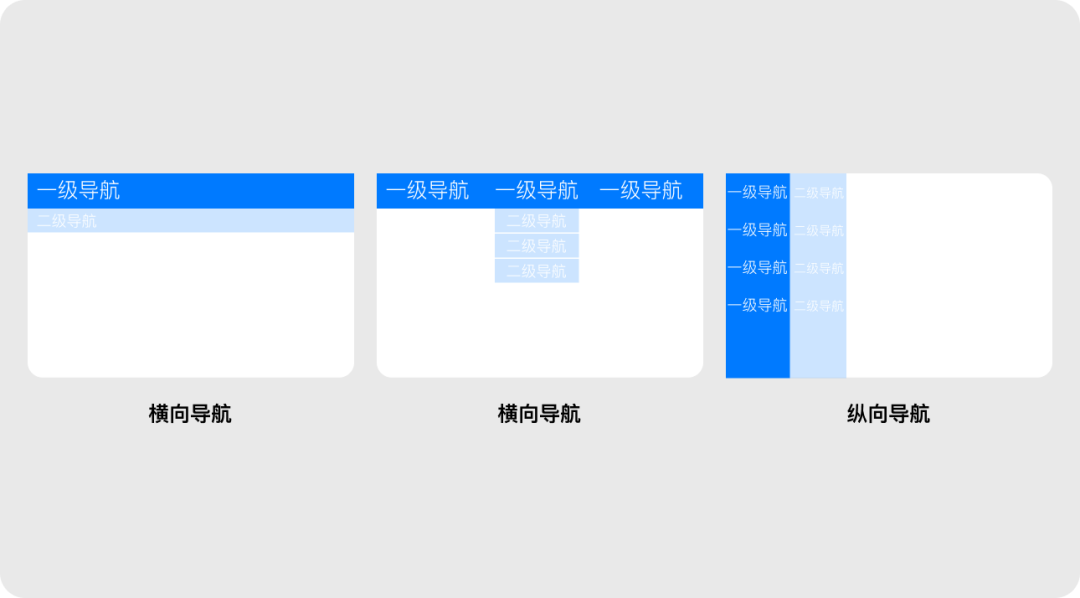 用戶的瀏覽動(dòng)線一般是左上到右下,所以全局導(dǎo)航一般被設(shè)置在頁面左側(cè)或頁面頂部。按照導(dǎo)航選項(xiàng)的權(quán)重或者優(yōu)先級(jí)一般分為三種樣式: