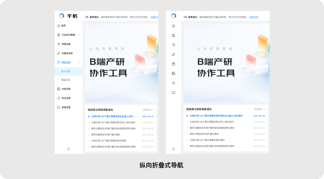縱向?qū)Ш街糜陧撁孀髠?cè),垂直延展,選項(xiàng)優(yōu)先級(jí)由上而下遞減。用戶可以在不同選項(xiàng)中快速切換,操作效率較高;縱向空間可以容納更多菜單選項(xiàng),并且可以延展二級(jí)分類。拓展性比較高,適合專注操作的后臺(tái)類產(chǎn)品。