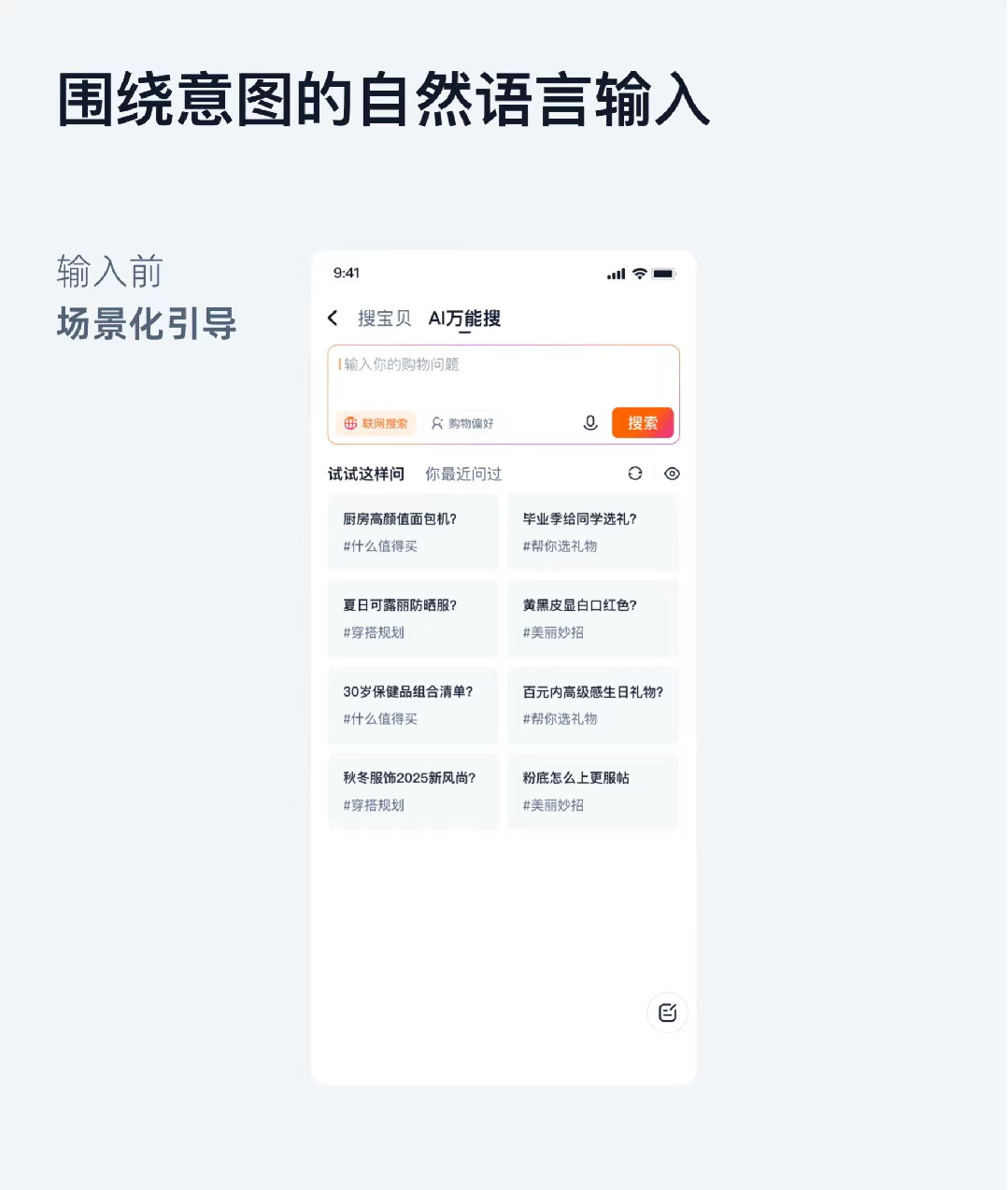 AI萬能搜激活頁,是智能預設后的意圖觸發器,沿用用戶最熟悉的傳統搜索形態的同時,通過整個頁面的場景化引導,鼓勵用戶進行自然語句的混合輸入;