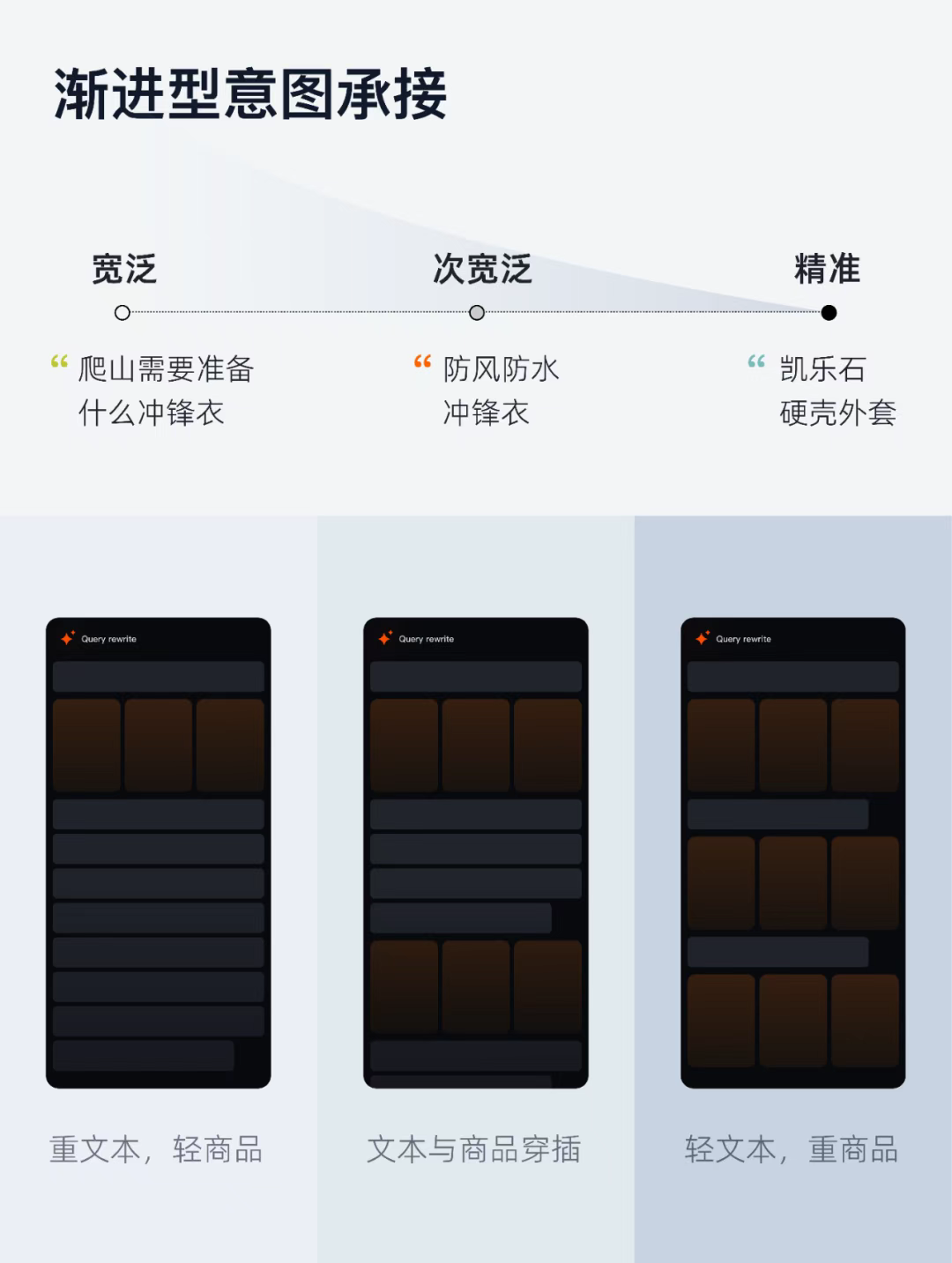 用戶的不同輸入代表了不同意圖,呈現出用戶從模糊寬泛到具體精確的變化光譜,在對話中提供如單品卡、多品卡、折疊流、清單卡片、穿搭卡片等多種形態,靈活匹配不同意圖的特征。