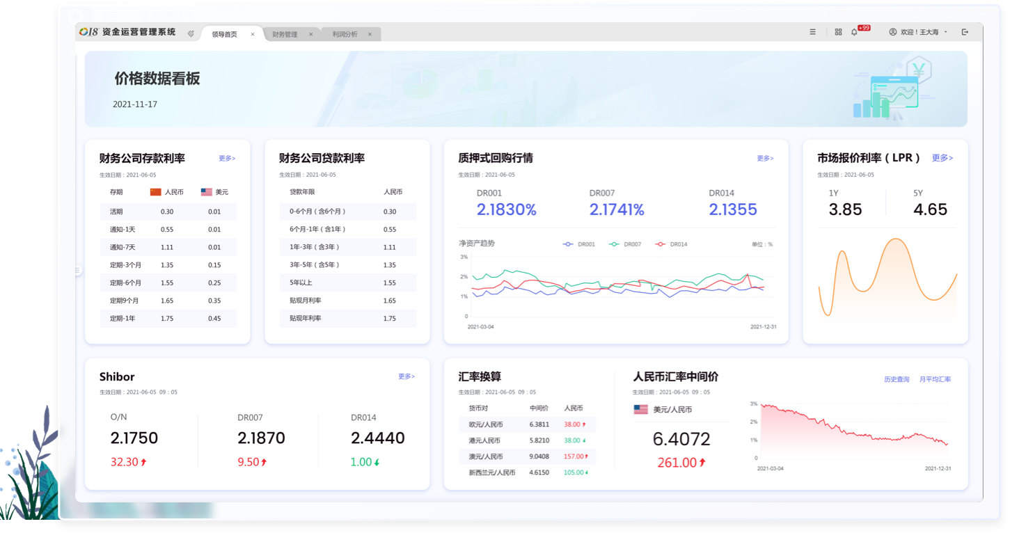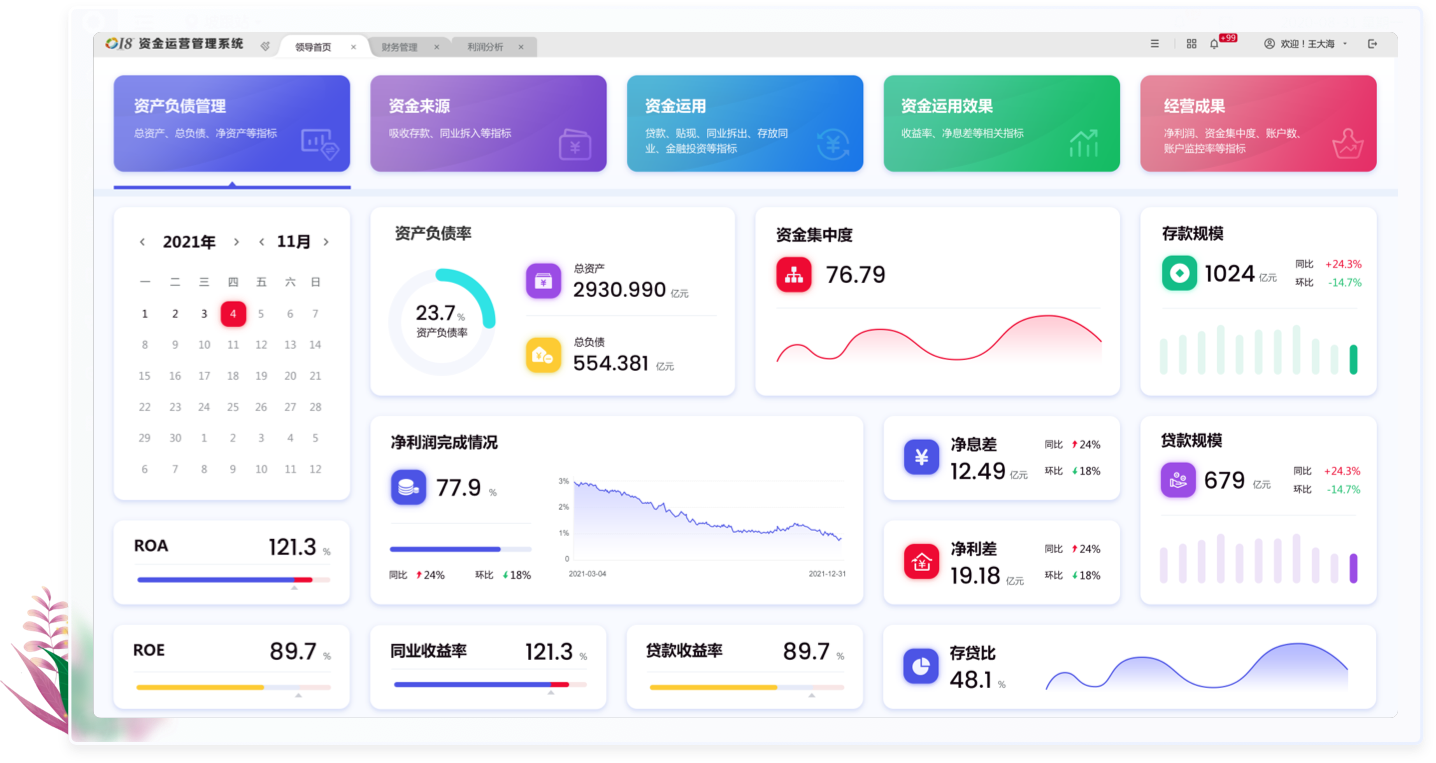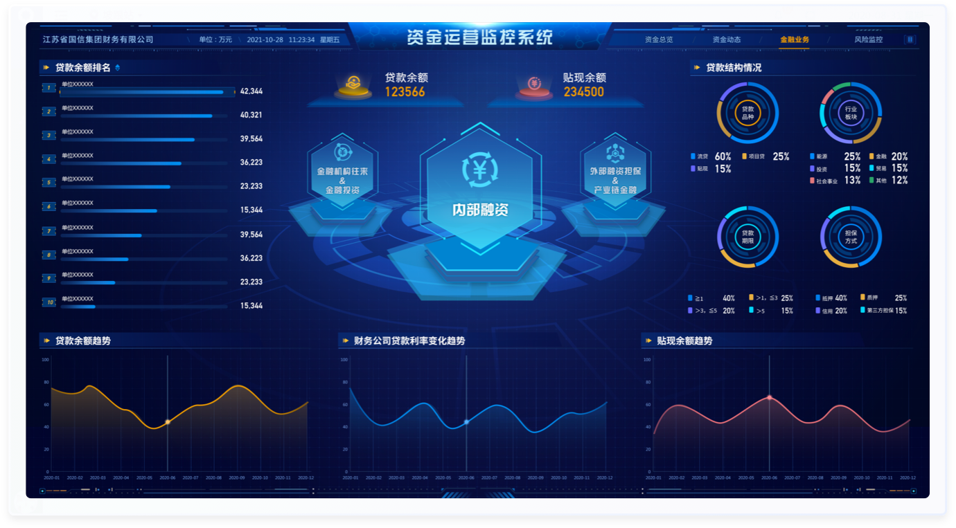 北京九恒星科技股份有限公司是一家企業資金管理軟件產品及企業金融信息增值服務的提供商,致力于通過信息技術的應用,幫助企業改善現金流;在金融機構與企業之間架起橋梁,讓企業的資金流更加順暢。大屏主要應用場景,公司會議,集團視察,行業參觀等。領導駕駛艙主要應用場景:財務公司各級領導日常運營決策查詢,公司會議等,是系統重要的展示功能,可作為系統特色功能或是門面,使用較為頻繁。